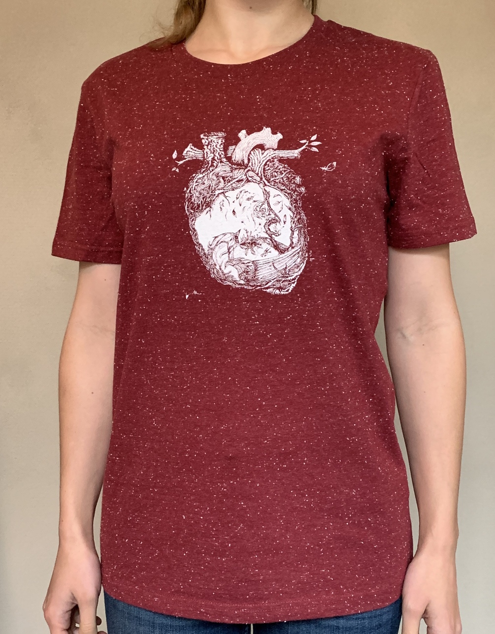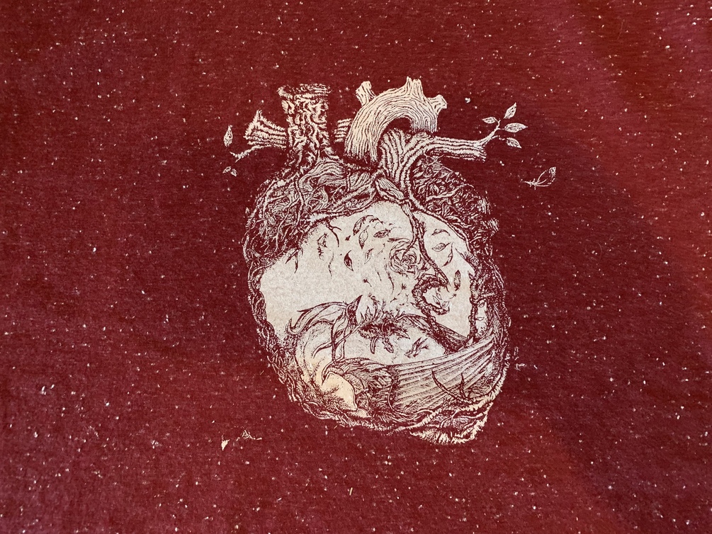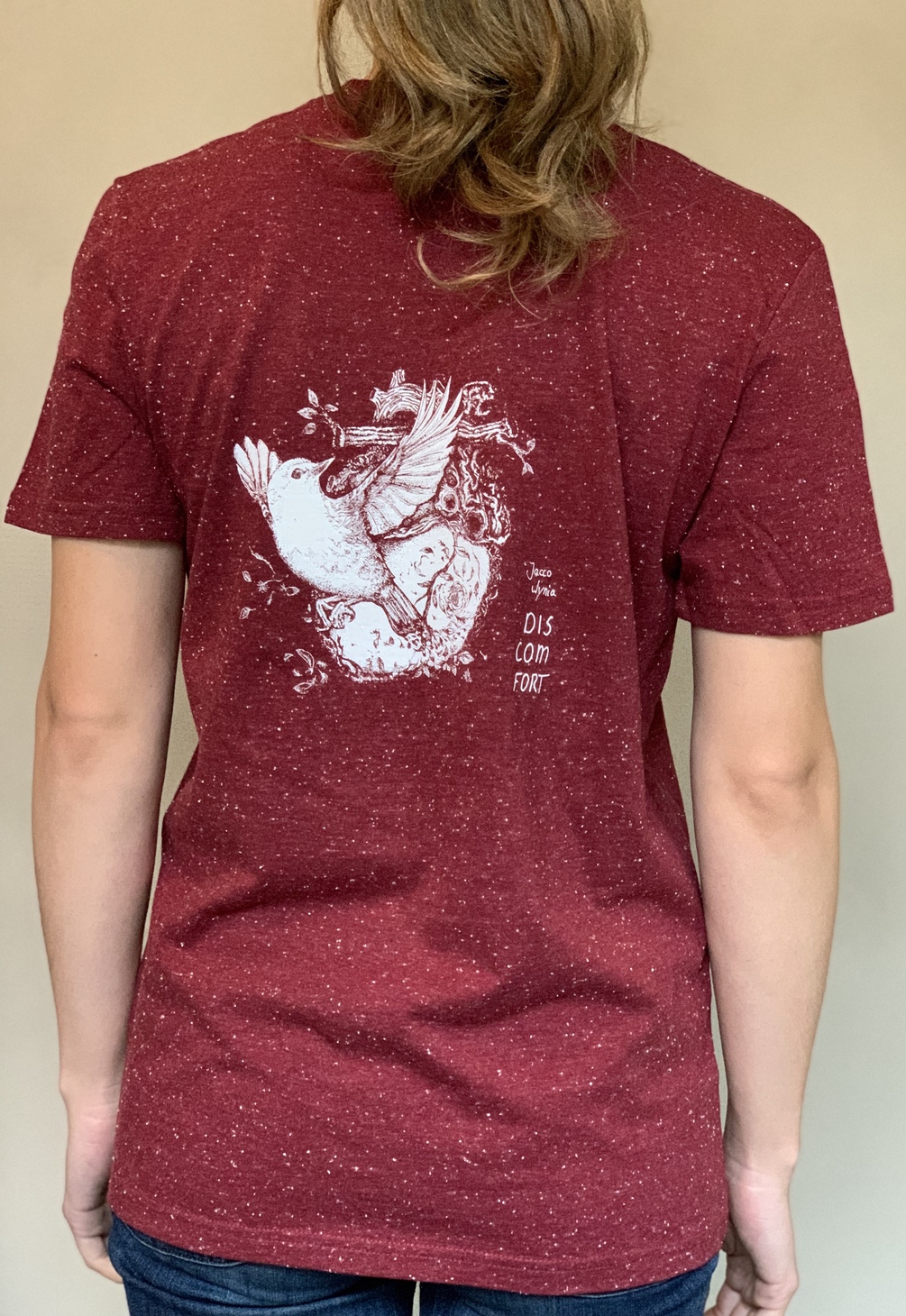 T-Shirt (organic cotton) with the beautiful artwork of the album 'Discomfort' (artwork by Ilse Schrauwers). The colour and fabric of the shirt were specially picked to match the artwork, to make a coherent whole.